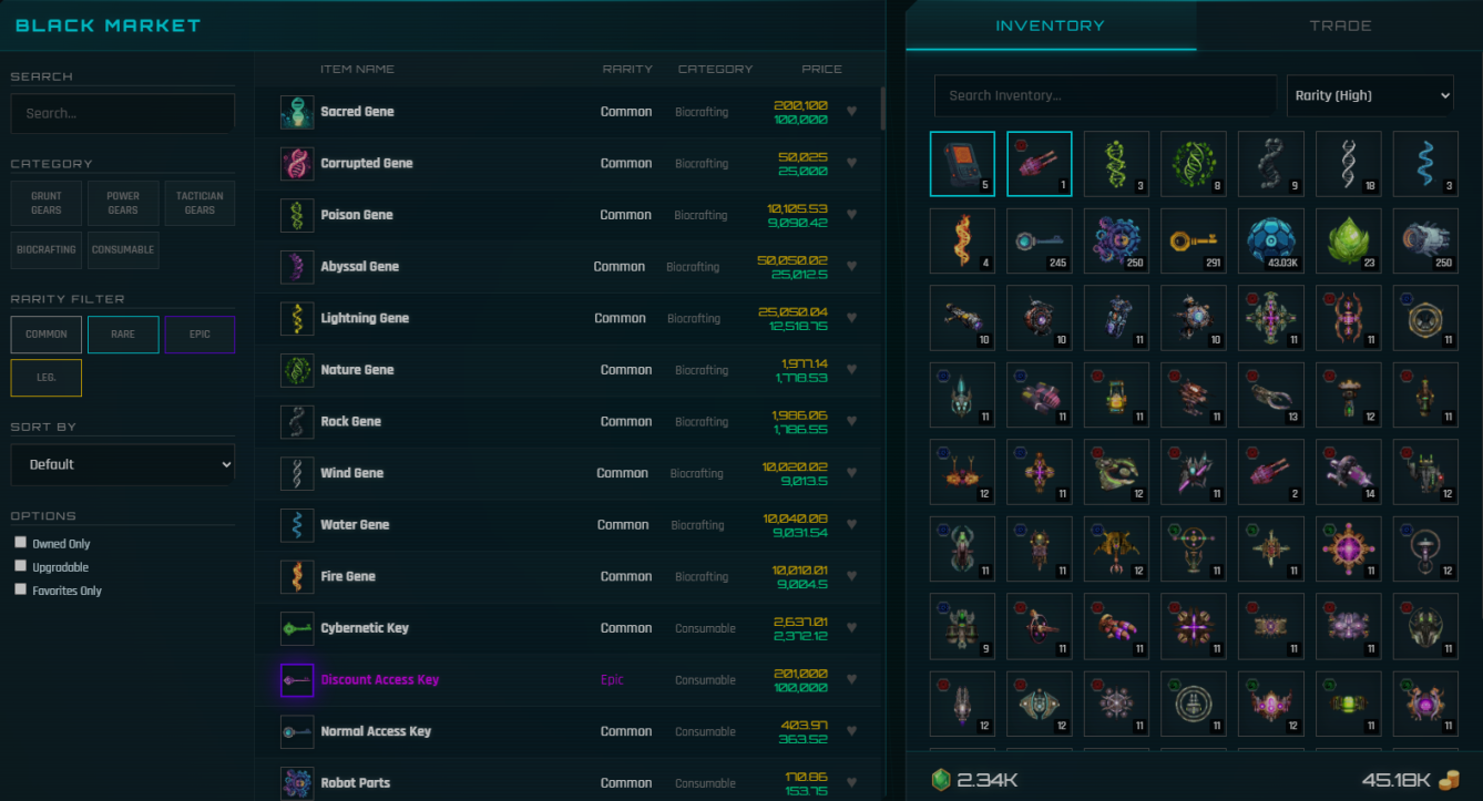 The Black Market is the central hub for trading virtual items using Credits. Tradable virtual items including Gears, Robot Parts, Artifacts, Keys, Lifeforces, Genes and more.