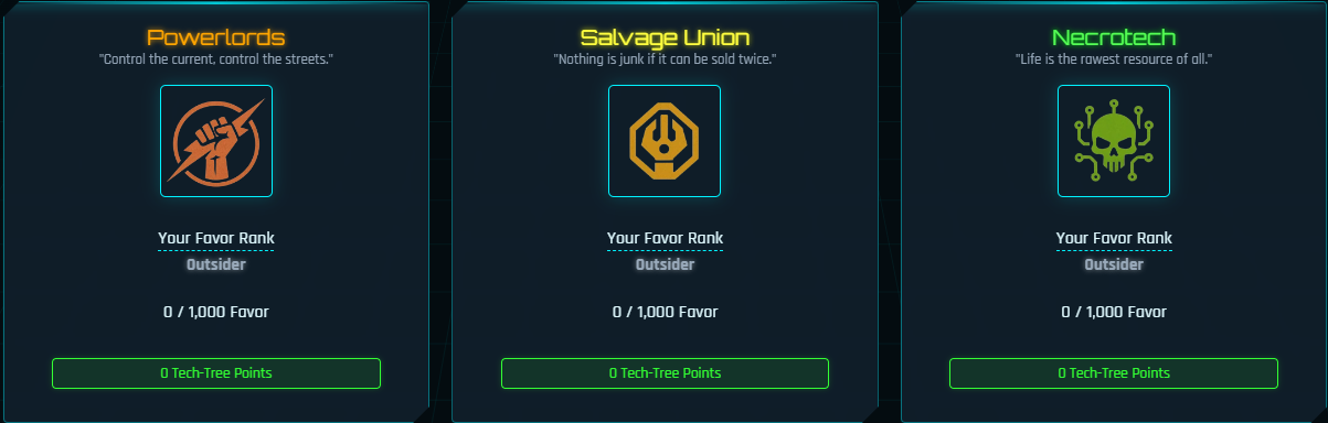 - Each Syndicate has its own Favor Rank: Outsider → Associate → Runner → Operator → Fixer → Enforcer → Inner Circle